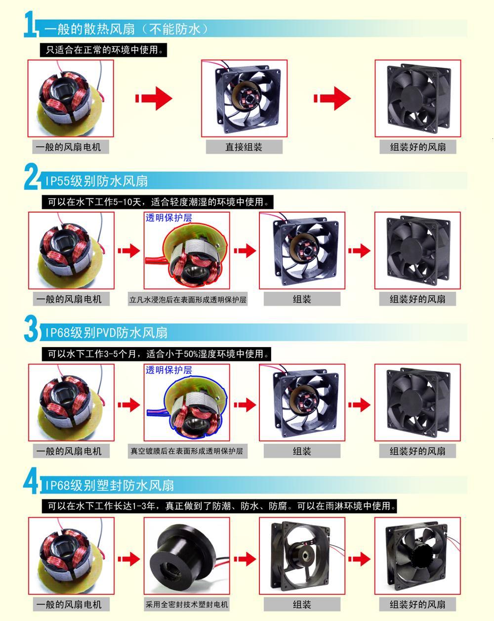 生產(chǎn)的5V,12V防水風機,24V,48V各種電壓的防水風機可完全放在水里工作,具體有高等級防水,防塵效果.這是專門為了解決水汽特別重,甚至風扇會進水的惡劣環(huán)境下特別研發(fā)制作的。